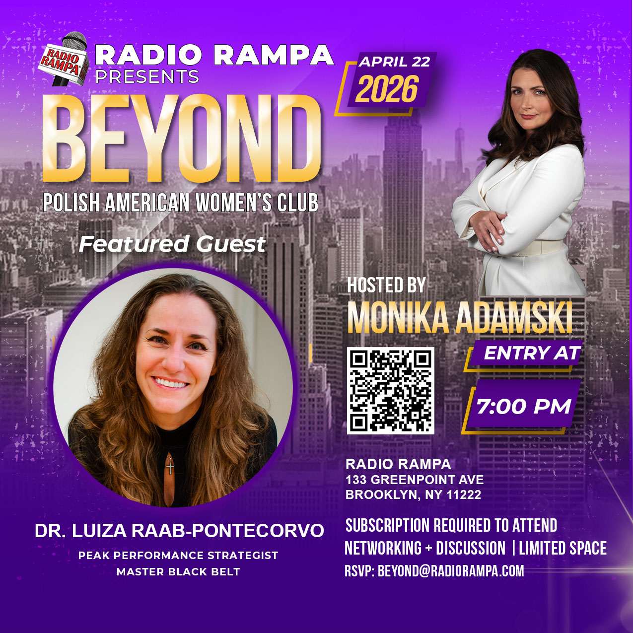 BEYOND Polish American Women’s Club to projekt Radio RAMPA stworzony, aby pielęgnować relacje biznesowe i społeczne wśród kobiet polskiego pochodzenia, łączyć kobiety polskiego pochodzenia z liderami, mentorami i pionierami w ich dziedzinie, a także pomagać kobietom polskiego pochodzenia w dotarciu do organizacji i zasobów dostępnych dla nich jako profesjonalistek w rejonie Nowego Jorku. Klub jest również oddany orędowaniu na rzecz interesów kobiet polskiego pochodzenia w Nowym Jorku i jego okolicach, a także z dumą prezentuje polskie dziedzictwo w Nowym Jorku.